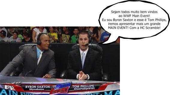 Após a famosa intro do Main Event e a pyro que deixou toda a arena alegre e entusiasmada vamos para a mesa de comentários ver oque Byron Saxton e Tom Phillips estão tramando.